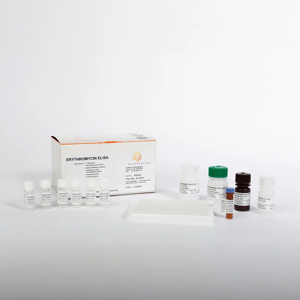 EuroProxima Erythromycin is a competitive enzyme immunoassay for screening and quantitative analysis of erythromycin in various matrices.