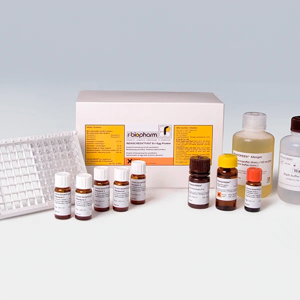 RIDASCREEN FAST Egg Protein is a sandwich ELISA for the quantification of egg protein in food. The method is calibrated according to NIST SRM 8445 egg powder (whole egg) and has no cross-reactivity to chicken meat.