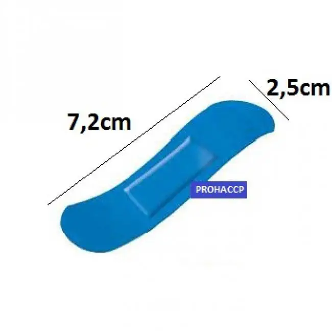 Blå detekterbare plastre 7.2×2.5cm, 100 stk. Lavet af PE med aluminiumsfolie. Opfylder fødevaresikkerhedsstandarder.