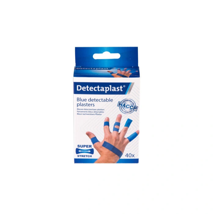 Praktisk box med 40 elastiske blå plastre i 5 forskellige størrelser, ideel til professionel brug i fødevareindustrien. Fremstillet af komfortabelt tekstilmateriale, HACCP-godkendt og designet til maksimal fleksibilitet og hygiejne. Perfekt til bevægelige kropsdele.