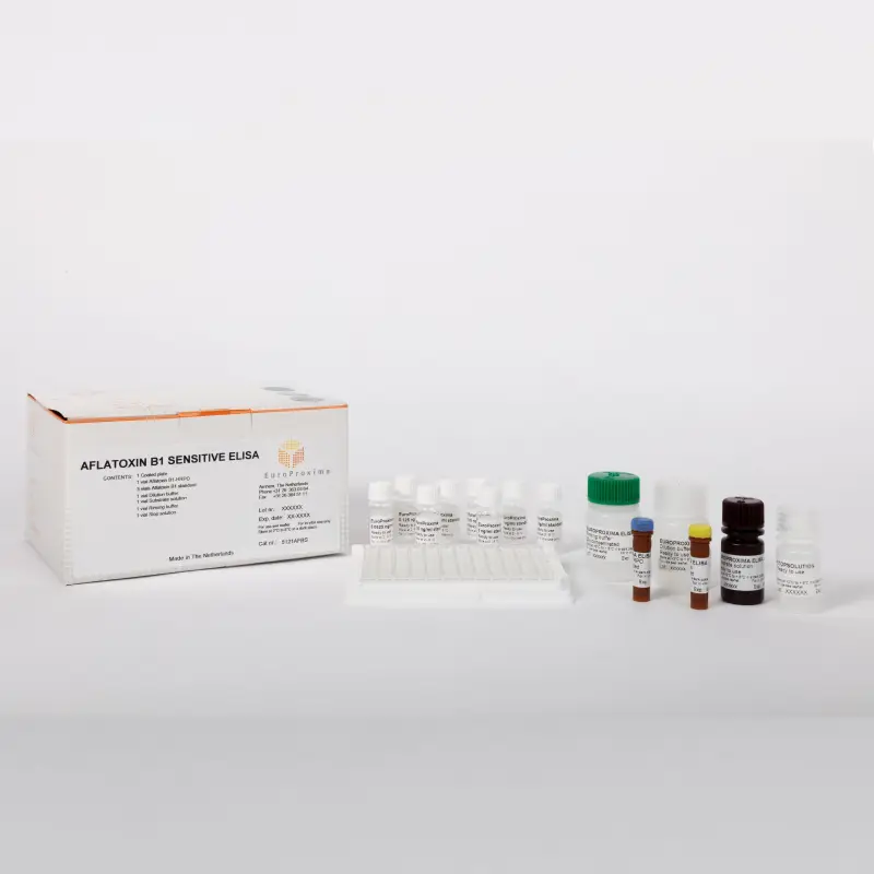 Følsomt ELISA-testkit til påvisning af aflatoxin B1 i korn, nødder, foder, spædbørnsprodukter, lever, rød peber og serum. Hurtig prøveforberedelse og lav LOD.