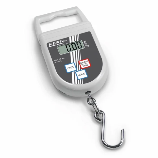 Kern hængevægt 0–20 kg med Hold-funktion, peak-hold og TÜV-certificering. Robust og kompakt til hurtig vejning i industri og privat brug.