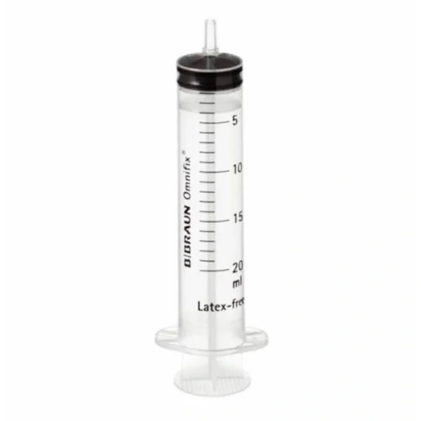 20 ml 3-komponente Omnifix® sprøjter med Luer, fremstillet i polypropylen og med sort graduering fra producenten B. Braun.