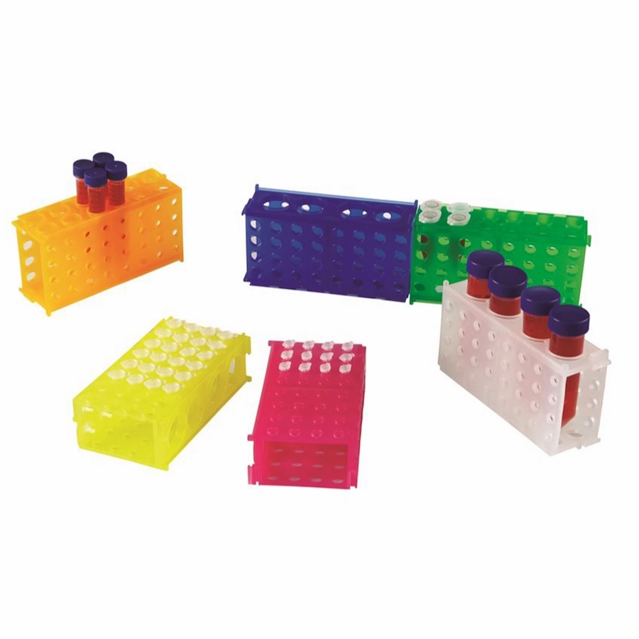 Vendbar rack med 4 sider. Racket har plads til 4 x 50 ml, 12 x 15 ml, 32 x 0,5 ml og 32 x 1,5/2 ml rør. Stativet er fremstillet i polypropylen og kan autoklaveres. De kan ydermere sammensættes i større moduler efter individuelle behov. Leveres i pakker á 5 stk. i assorterede farver.