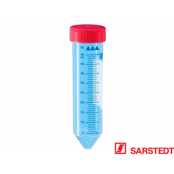 Sterile 50 ml centrifugerør fremstillet i polypropylen (PP) med blå graduering og hvidt skrivefelt. Centrifugerørene er med påmonteret rødt skruelåg fremstillet i HD-PE. 25 stk./pose – 300 stk./karton.